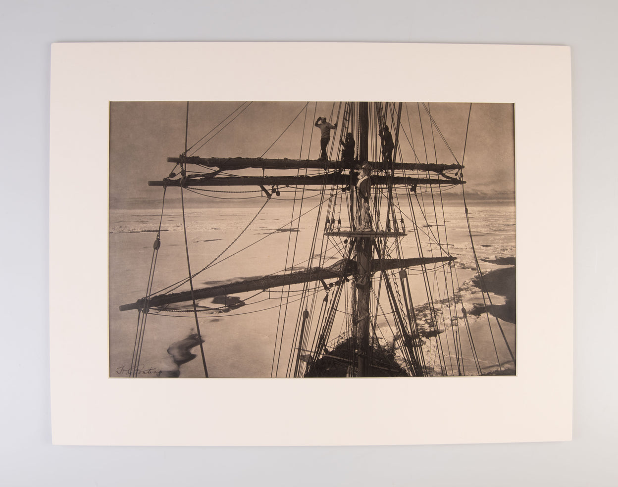 A beautiful photograph from the Heroic Age, showing three members of the crew of the Terra Nova, up high in the rigging of the ship, with the Antarctic pack ice stretching to the horizon and beyond.